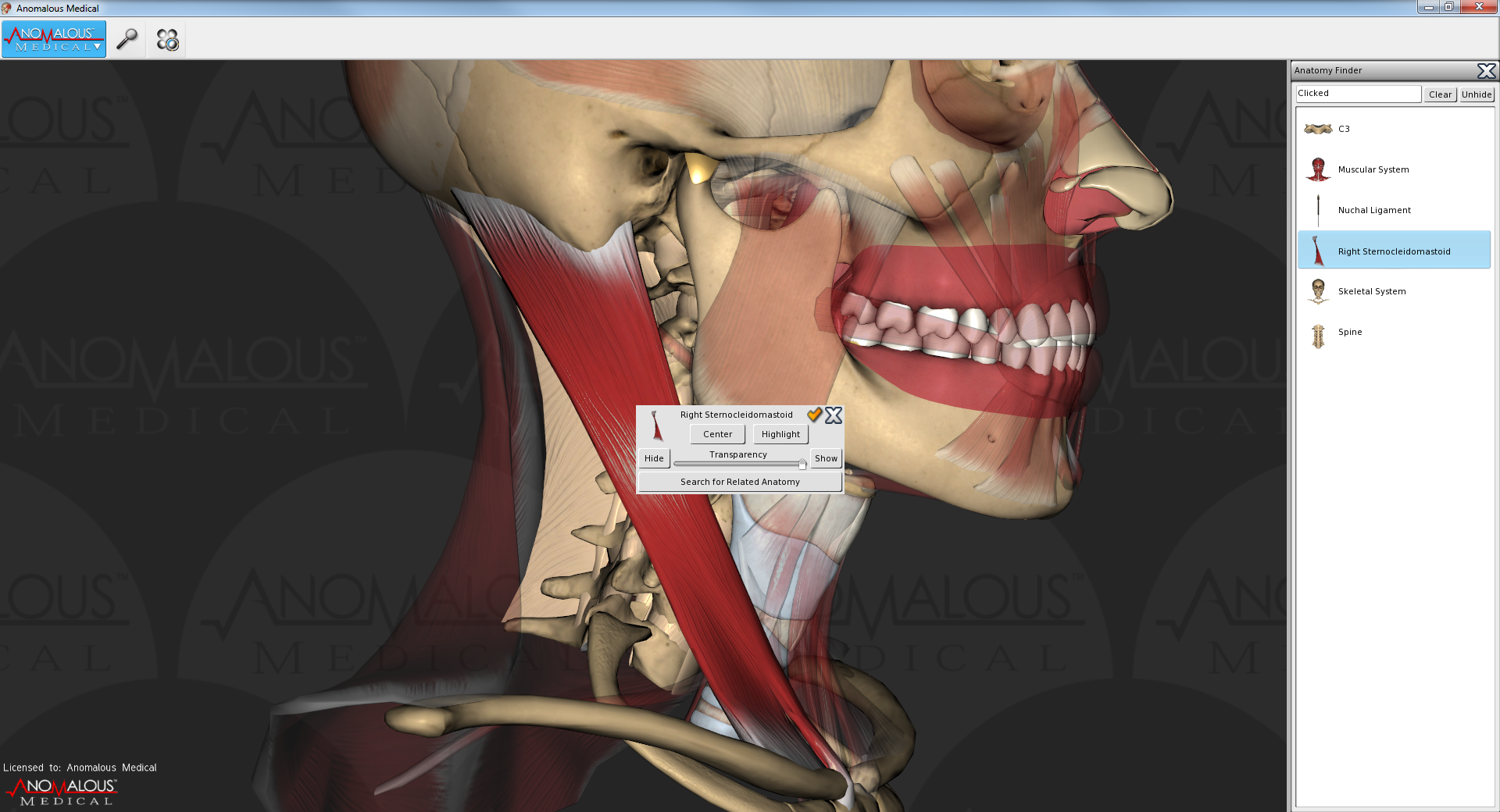 Explore the Sternocleidomastoid muscles in Anomalous Medical. Anomalous Medical is a 3D anatomy simulation program that anyone can use to learn about or teach someone about the human body.