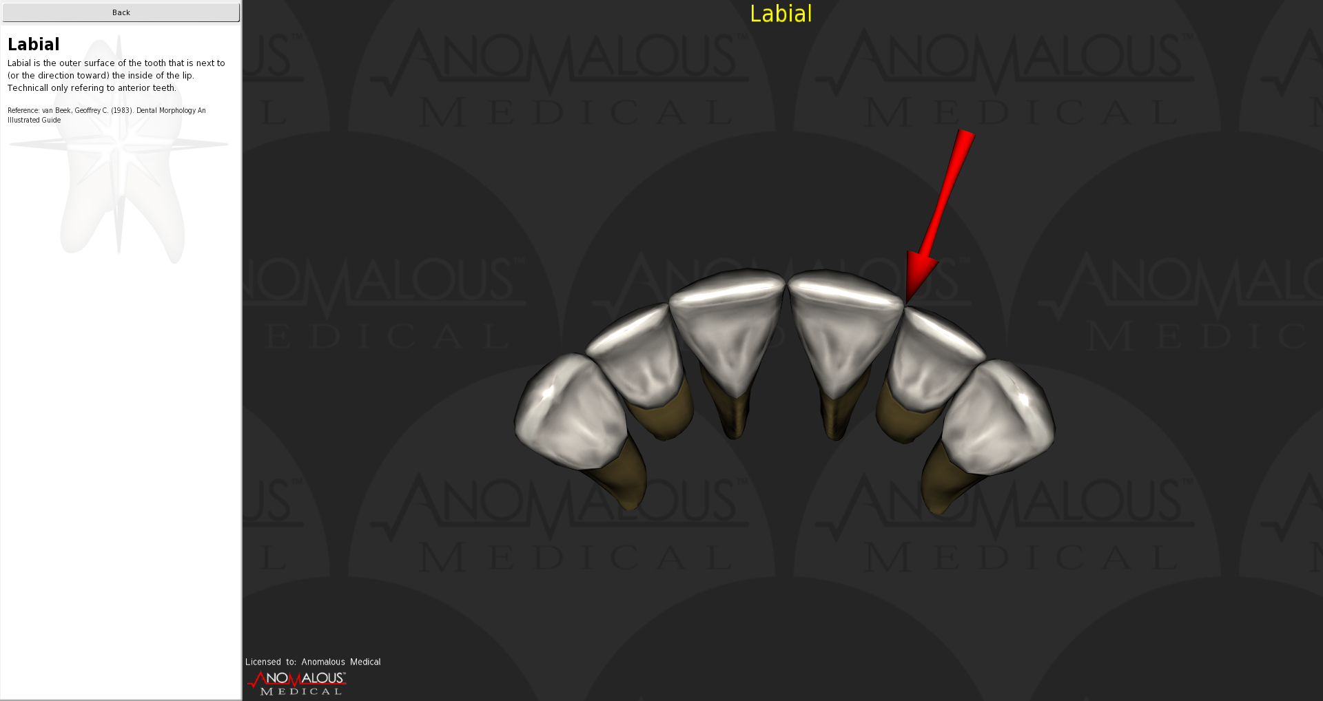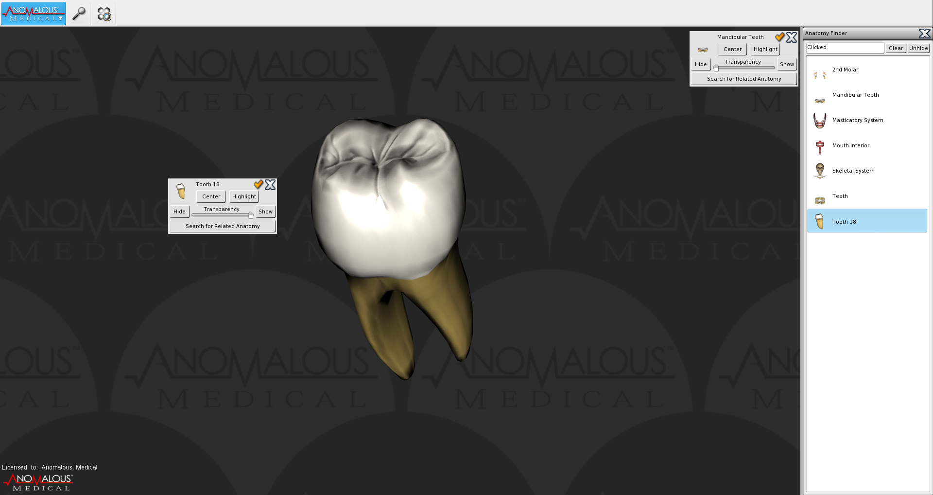 Anomalous Medical is a great way to explore teeth anatomy. With the free version you can view the maxillary and mandibular teeth and the anatomy that surrounds them. For a more in-depth view, the Premium Features will let you select each tooth individually and isolate specfic anatomy strutures related to the teeth.