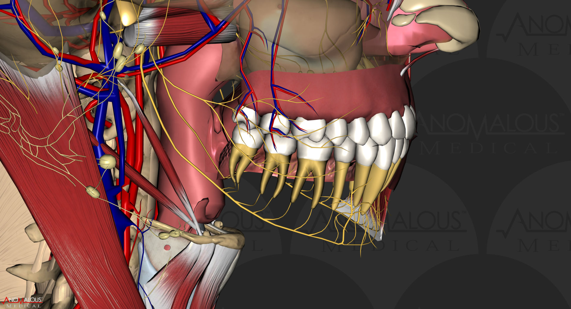 Anomalous Medical includes jaw anatomy, mandible anatomy, mouth anatomy, tooth anatomy, muslce anatomy, and more. All anatomy are accurate 3D model representations.